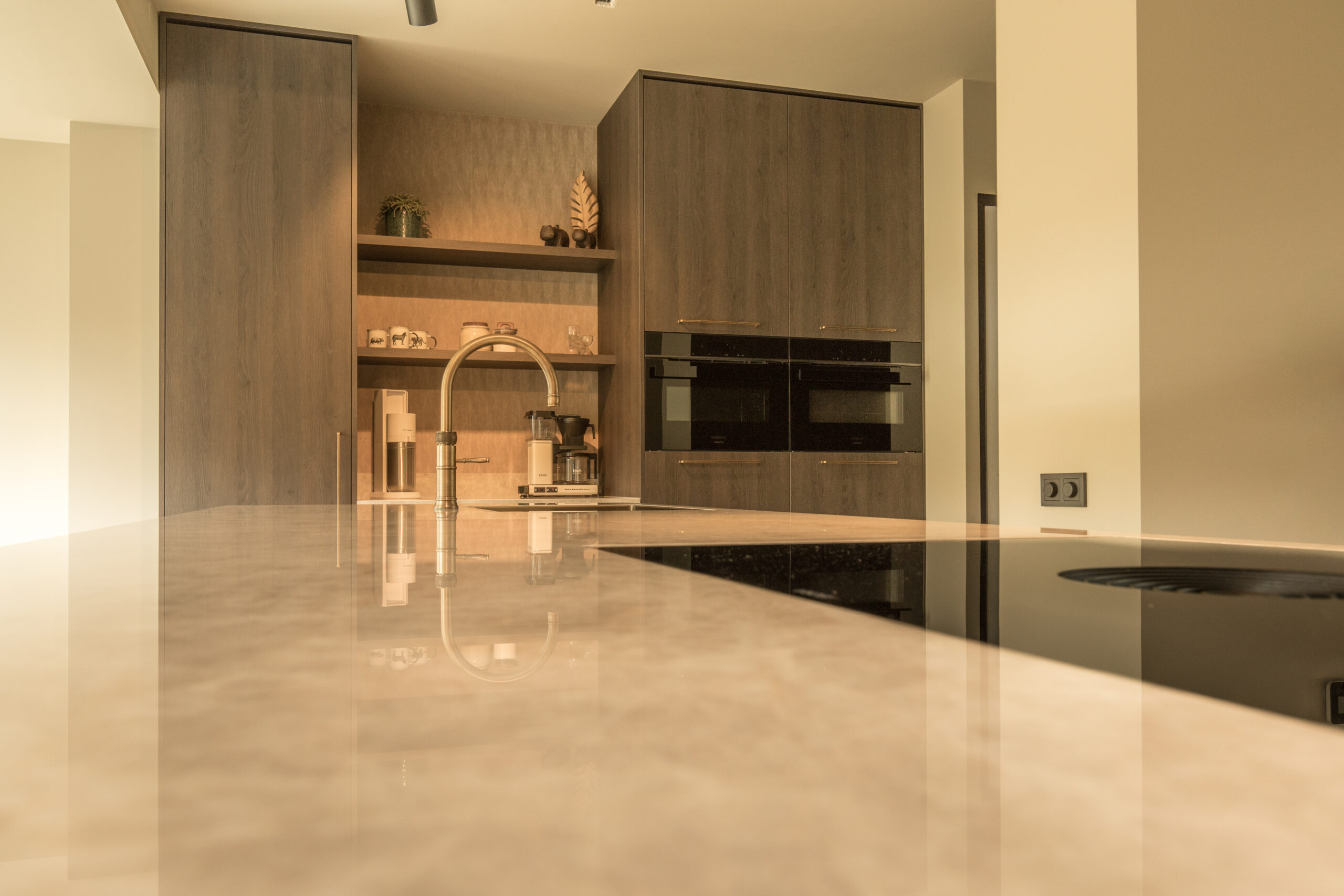 Waan je even in een luxeresort bij dit project. Wij mochten dit project leveren in de stijl die momenteel bij velen de harten steelt. De warme aardetinten in de houtnerf van de keuken, met daar tegenover luxe elegantie van het hoogglans keramieken werkblad in Taj Mahal look. De messing patina Quooker en de bijbehorende messing patina gootsteen maken het een warm geheel. Door deze kleuren door te trekken in de handgrepen en decoratie ademt dit project luxe en elegantie. Door dezelfde warm-houten vensterbanken wordt de gehele ruimte één geheel. Deze high-end uitstraling is doorgetrokken naar de badkamer, waar ook weer de prachtige beige hoogglans keramiek in Taj Mahal look werd gebruikt voor een badmeubel met luxe, serene uitstraling.