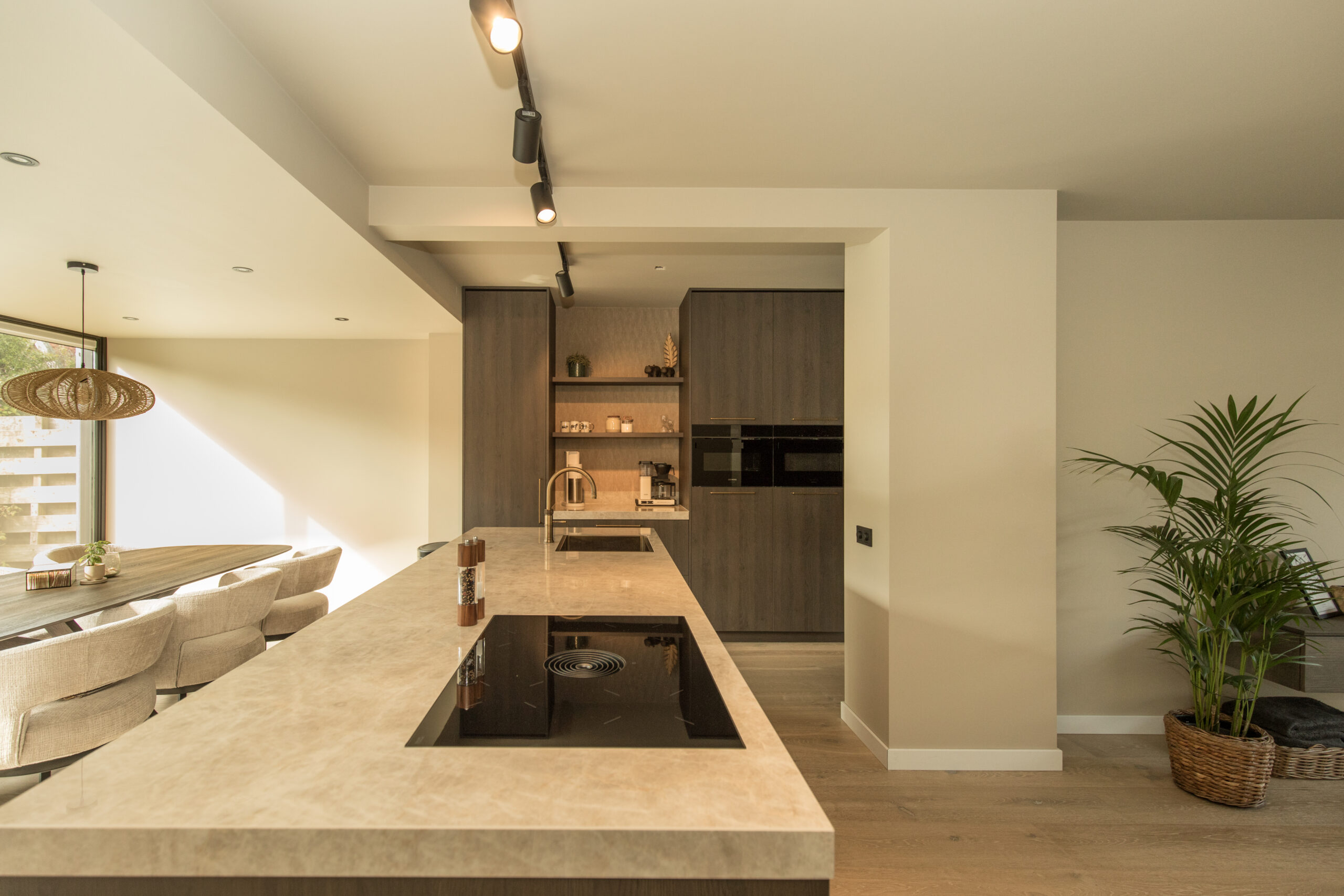 Door de serene eenvoud van Japandi elementen toe te voegen aan de warme doordachte kleurpaletten, is bij dit project een prachtige multifunctionele elegante ruimte gecreëerd. De keuken ademt een kalme sfeer dankzij de rustige tinten en een prachtig natuurstenen blad. Een imposante, donkerhouten wandkast met een naadloos ingebouwde doorgang biedt niet alleen royal opbergruimte, maar voegt ook een element van ingetogen luxe toe. Daarbij hebben wij een lange, lage kast geplaatst met schuifladen, die dienstdoen als stijlvolle presentatiebladen. Het geheel werd volledig volgens wensen van de klant voorzien van een groot midden-bureau dat uitnodigt tot werken, creëren en ontmoeten. Ontdek hoe we functionaliteit en finesse, naar wensen van de klant, hebben verenigd in dit unieke project.