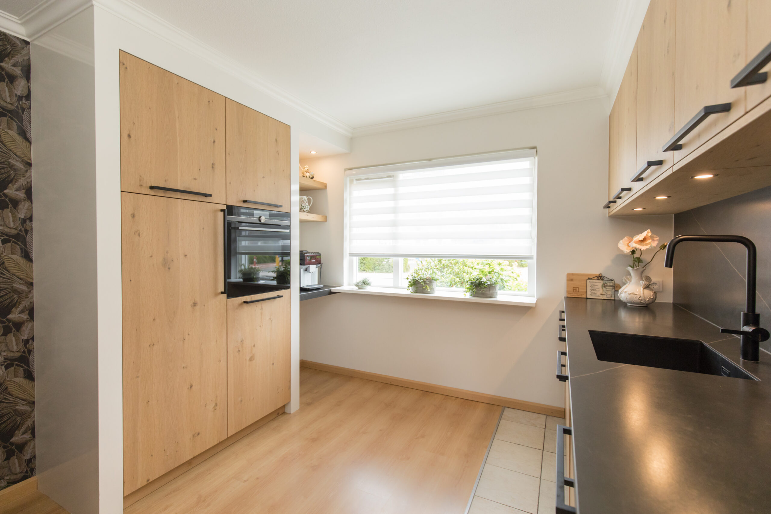 Een keuken is meer dan een plek om te koken; het is het kloppende hart van het huis. In dit project hebben we een bestaande, landelijk lichte keuken een compleet nieuwe uitstraling gegeven. Door de juiste materiaalkeuzes is een ruimte ontstaan die meer elegantie en warmte uitstraalt, met behoud van het landelijke karakter. De grootste transformatie is teweeggebracht door de introductie van nieuwe, zwart-houten frontjes. Deze gedurfde keuze geeft de keuken direct een chique en moderne uitstraling, terwijl de natuurlijke houtnerf de landelijke charme behoudt. Maar daar bleef het niet bij. We realiseerden ook een grote, zwarte maatwerk opbergkast, die niet alleen extra ruimte biedt, maar ook een krachtig statement maakt in de ruimte. Tot slot kregen alle vensterbanken een upgrade naar rustiek eikenhout, wat de warme sfeer verder versterkt en zorgt voor een harmonieus geheel. Kijk mee hoe deze make-over bewijst dat zelfs subtiele veranderingen een wereld van verschil kunnen maken in de uitstraling en sfeer van uw keuken.