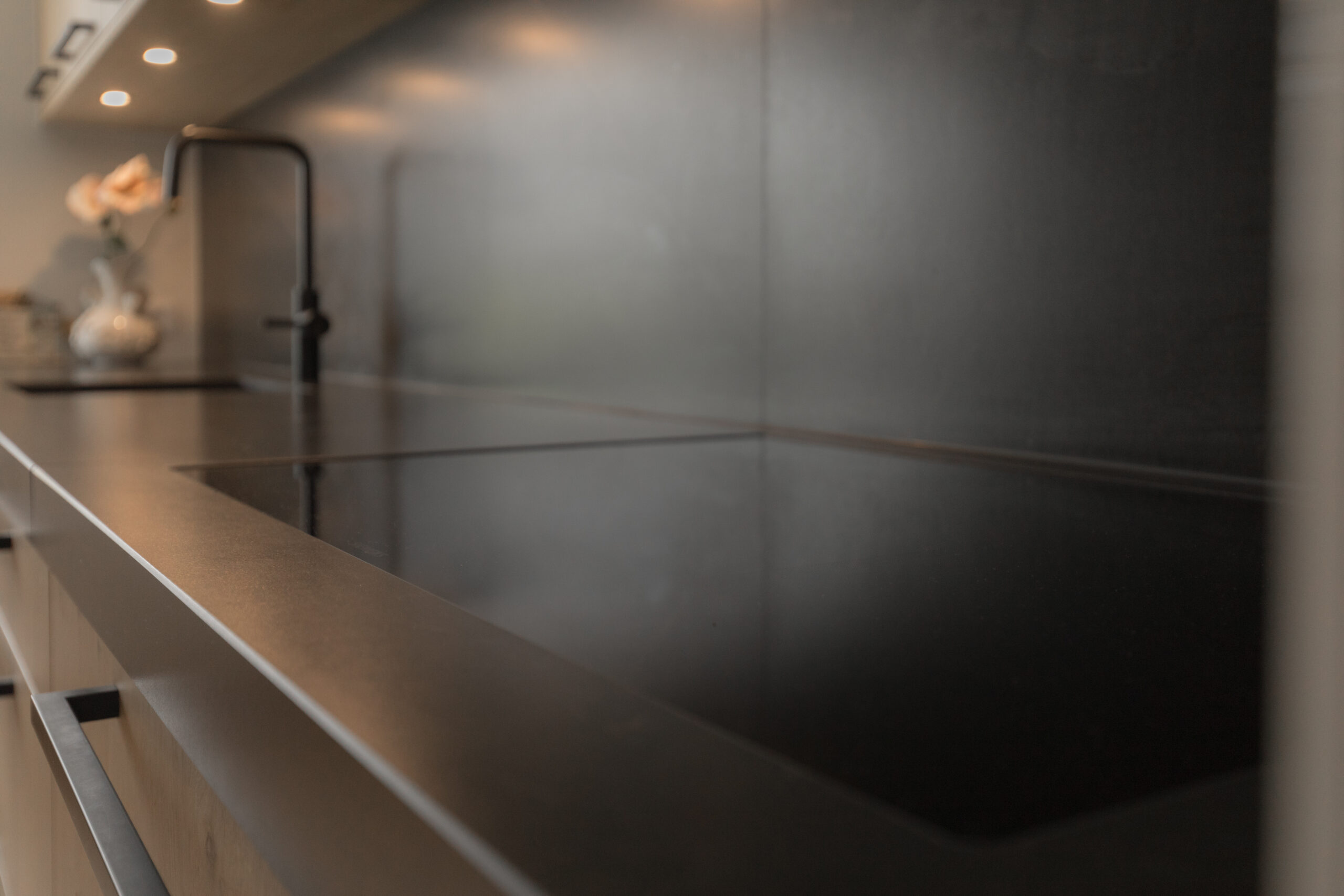 In dit project lag de focus op het creëren van een rustige, warme, tijdloze, keuken. Voor de fronten van de keuken hebben we gekozen voor eikenhout met een natuurlijke, levendige uitstraling. Om de serene look te garanderen loopt de houtnerf vrijwel naadloos door over de verschillende kasten en lades. De strakke, matzwarte grepen, het diepzwarte werkblad en de donkere achterwand vormen een elegant contrast met het warme eiken. Warm en tijdloos. De ware uitdaging van dit project was het optimaal benutten van de ruimte naast de hoge keukenkasten door het creëren van een gezellige 'pauze'-plek. De open, lichte houten schappen en subtiele inbouwspots zorgen voor een warme gloed. De combinatie van het strakke, moderne eiken in de keukenwand en de warme, sfeervolle oplossing in de hoek, toont onze expertise in zowel strak design als functioneel maatwerk.